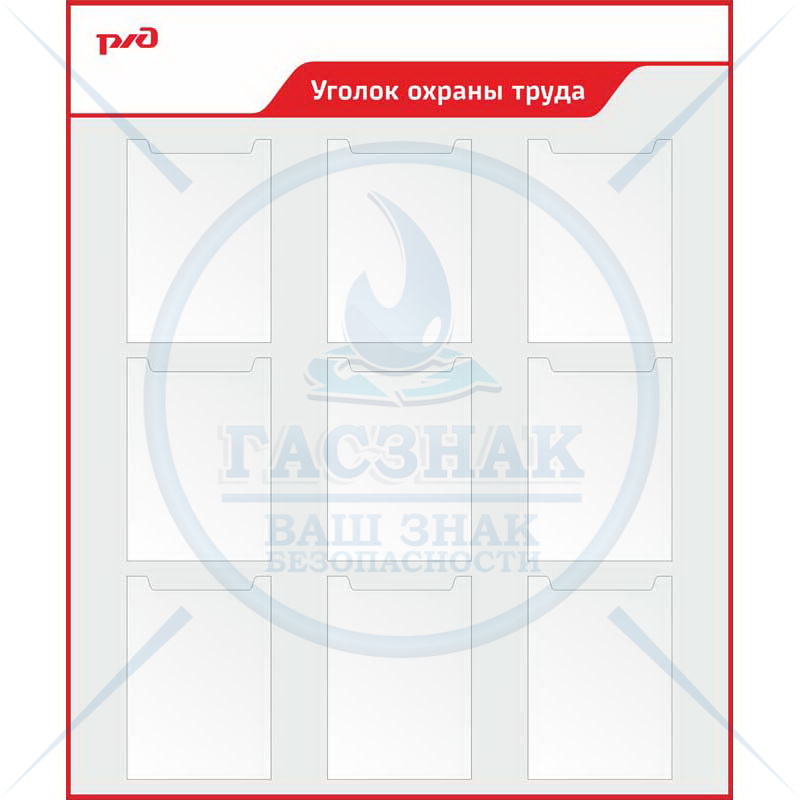 Стенд Уголок охраны труда, 1 горизонтальный карман А3, 4 объемных кармана А4, 5 плоских карманов А4 (1650х950; Пластик ПВХ 4 мм, пластиковый профиль; )